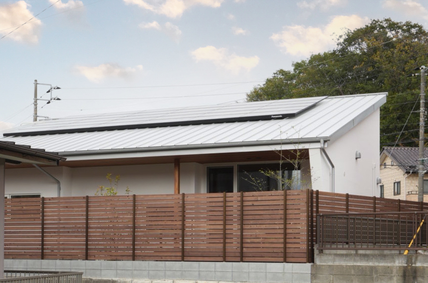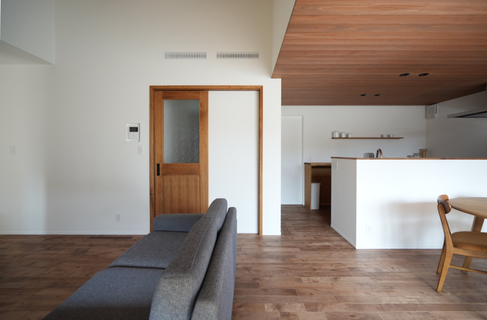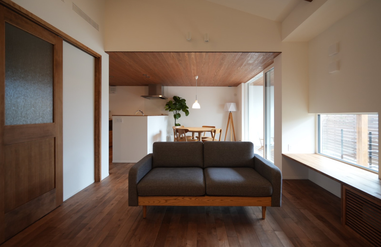 構ダイニングの天井から軒天へと板張りが続き、窓を挟んで空間がひとつながりに。