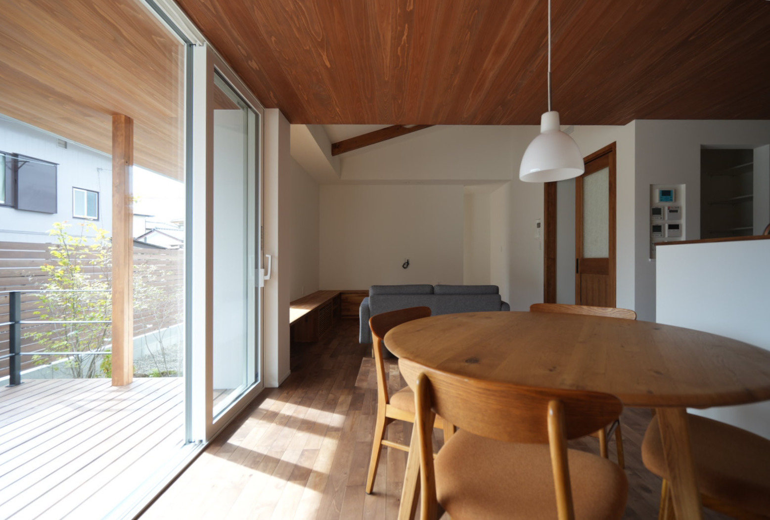 窓を開ければウッドデッキがダイニングの延長となり、外の風を感じながら食卓を囲めます。