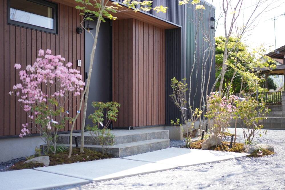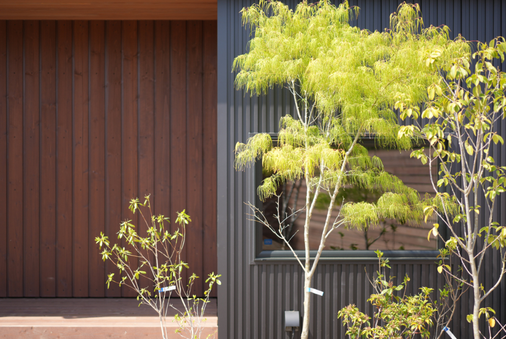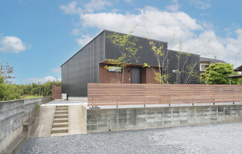黒いガルバと木の外壁が、上質で落ち着いた佇まいを描く。